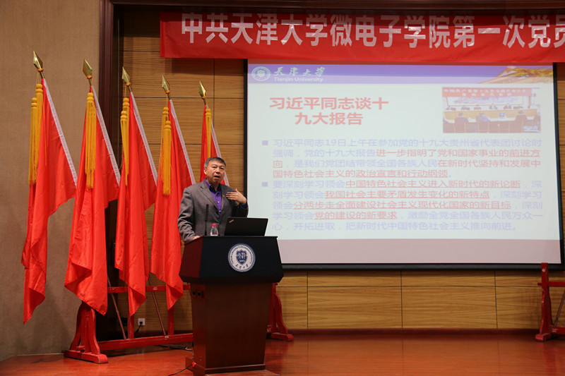 本站讯(通讯员:赵雪)2017年12月16日上午,在微电子学院党委召开第一次党员大会之际,校党委常务副书记舒歌群同志受邀为学院师生党员上了一堂题为《学习贯彻十九大精神,用习近平教育思想指导一流大学建设》的主题党课。