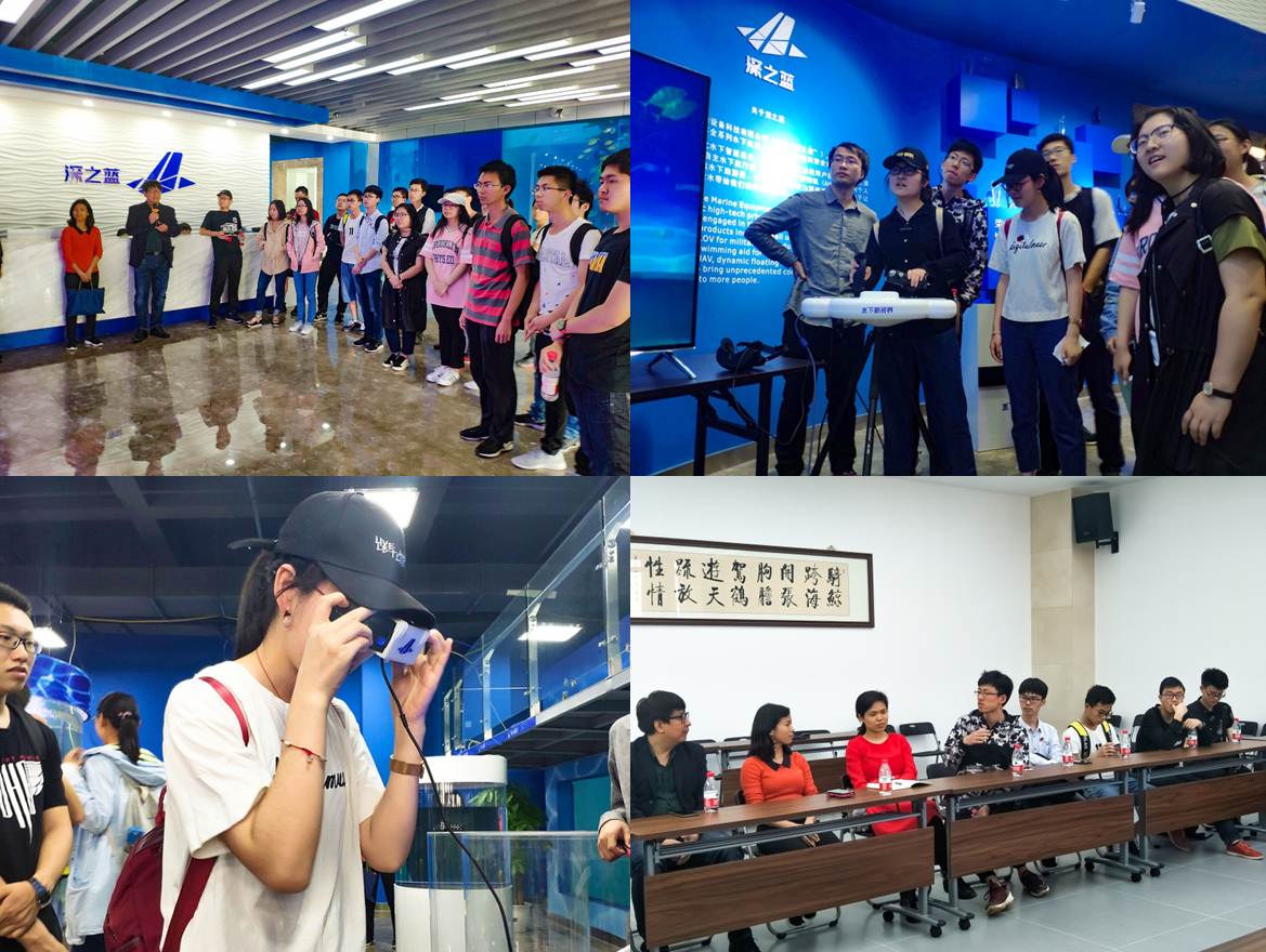 进入公司大厅,刘奇首先代表公司表达了对我院师生的热烈欢迎,他为同学们详细介绍了深之蓝的成立背景、市场推广、主要产品应用、核心竞争力及发展愿景等基本情况,结合视频讲解了海洋观测、水下涵洞检查、事故证据收集等实际应用场景。其中,“海翼”水下滑翔机以及曾获德国“红点奖”的白鲨MIX水下机器人迅速抓住了同学们的眼球并获得赞叹连连。随后,刘总及侯工程师带领同学们到公司展区进行参观,除零距离接触自主水下航行器(AUV)、水下滑翔机(AUG) 以及缆控水下机器人(ROV)等小型水下运动载体,学员们更有机会深度体验了白鲨MIX水下机器人操控、通过VR眼镜实时全景观看青岛海洋水体景色等项目,在亲自互动过程中,进一步感受科技魅力。参观过程中,满满的一面专利墙,更彰显出自主知识产权的重要地位以及企业的社会责任。