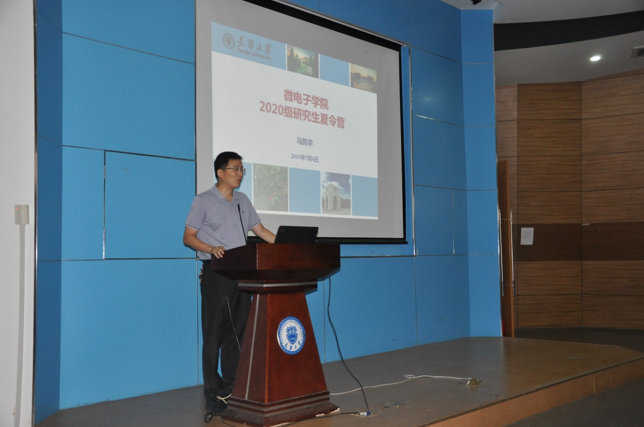 6日上午,开营仪式在26楼报告厅举行,开营仪式由学院青年教师宋航主持。副院长徐江涛代表学院对全国各高校优秀学子的到来表示热烈欢迎,介绍了天津大学、微电子学院的历史和发展、本届“优秀大学生夏令营”的核心目标及后续活动安排,期望营员们能有所收获;院长马凯学介绍了学院的师资力量、科研情况、学科特色、招生情况、奖助体系等,希望营员们在两天时间内能够更多的感受天津大学和微电子学院的底蕴和风采。