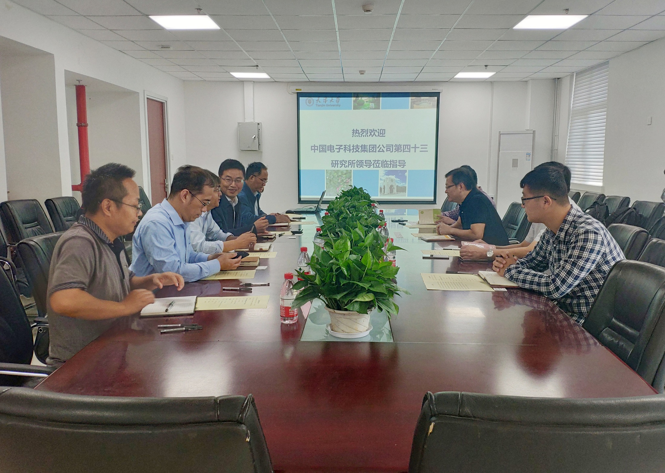本站讯(通讯员:王楠)2019年9月20日上午,中国电子科技集团公司第四十三研究所副总工程师雷剑、事业部主任於灵等一行4人到访天津大学微电子学院。微电子学院院长马凯学教授,副院长徐江涛教授,天津纳米颗粒与纳米系统国际研究中心执行主任马雷教授,教师代表赵毅强教授、高静副教授和王秀宇副教授等与到访来宾进行会谈。