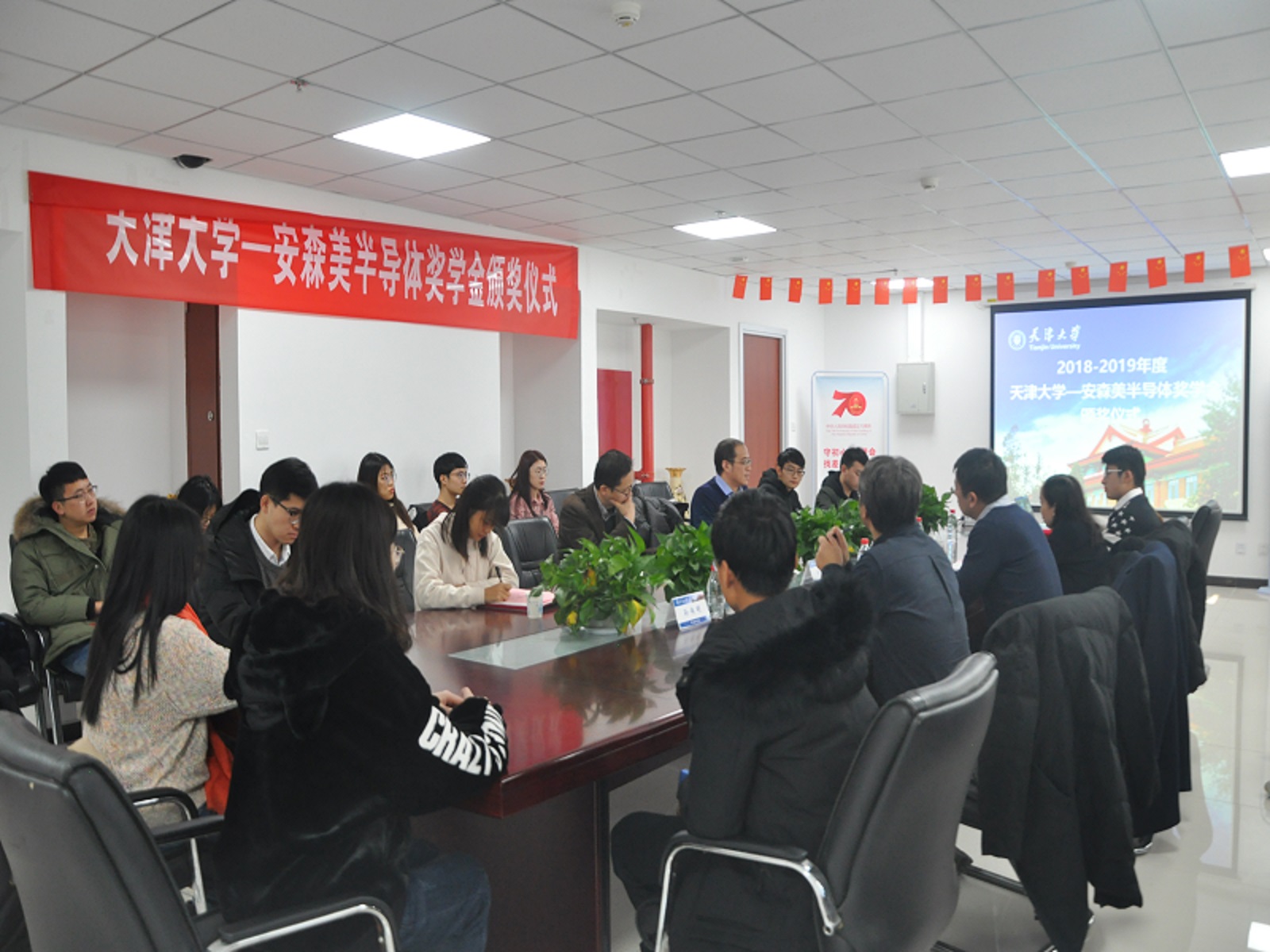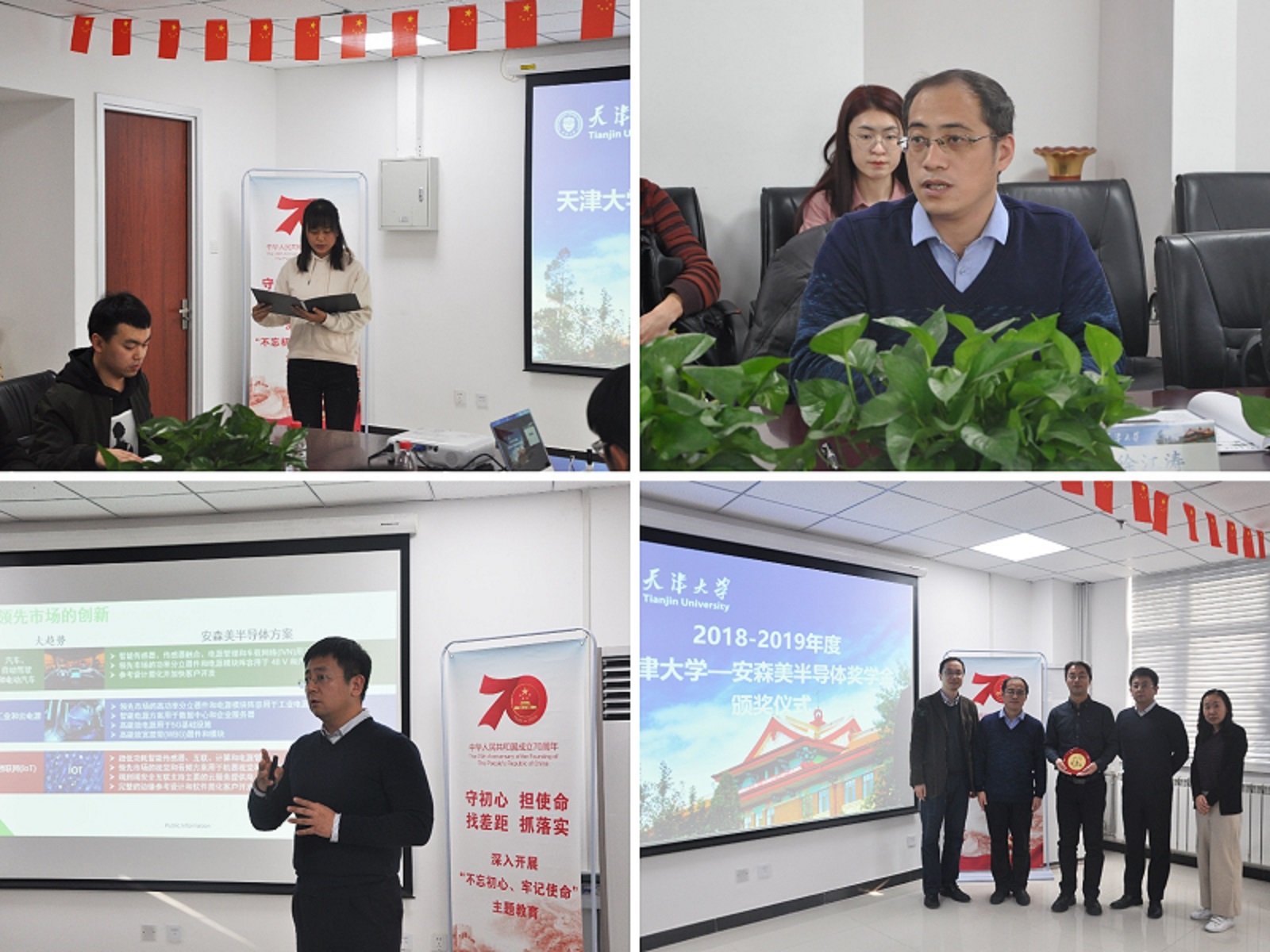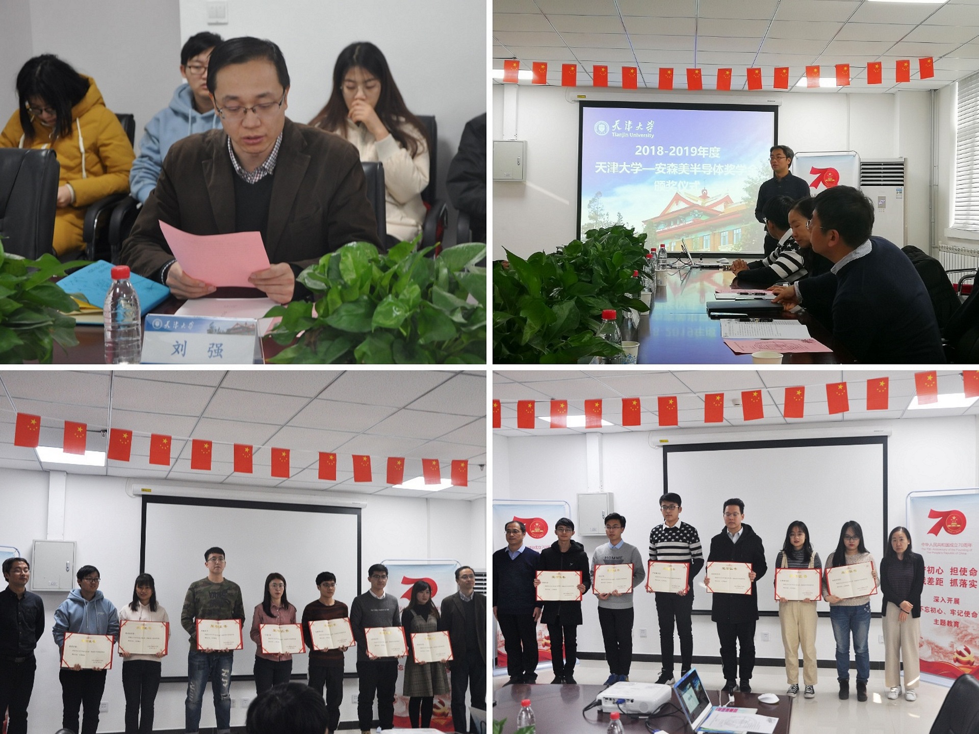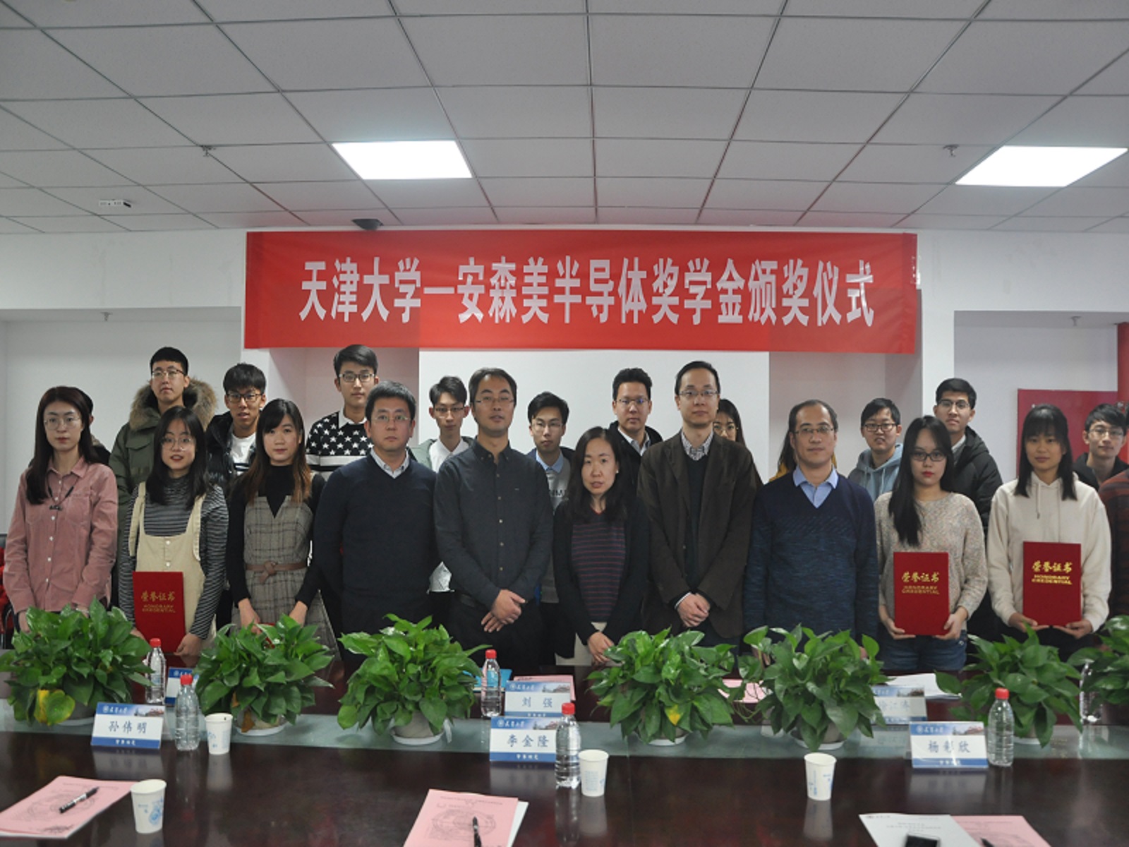 本站讯(通讯员:张怡哲)2019年12月6月,天津大学-安森美半导体奖学金颁奖仪式于微电子学院20教学楼228室举行。安森美半导体公司相关负责人李金隆先生、孙伟明先生、杨彩欣女士,学院副院长刘强老师、徐江涛老师以及2018-2019年度天津大学-安森美半导体奖学金获奖学生出席本次活动,活动由徐义桐老师主持。