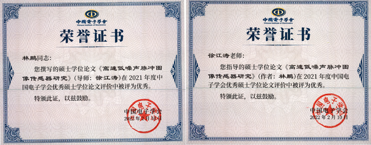 本站讯(通讯员:张珊)近日,中国电子学会颁发了2021年度优秀硕士学位论文奖。我院微电子学与固体电子学2021届硕士研究生林鹏同学的硕士论文《高速低噪声脉冲图像传感器研究》被评为中国电子学会2021年度优秀硕士学位论文,指导教师为徐江涛教授。