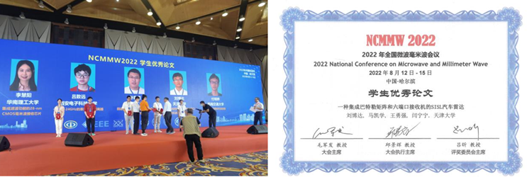 本站讯(通讯员:闫宁宁)2022年8月,天津大学微电子学院互联感知集成电路与系统团队刘博达同学在国内微波界顶级会议“2022年全国微波毫米波会议”(National Conference on Microwave and Millimeter Wave, NCMMW)发表了《一种集成巴特勒矩阵和六端口接收机的SISL汽车雷达》的论文,并获得大会“学生优秀论文奖”。天津大学为论文单位和通讯作者单位,2022届硕士研究生刘博达为第一作者,由马凯学教授,王勇强副教授和闫宁宁副教授共同指导。