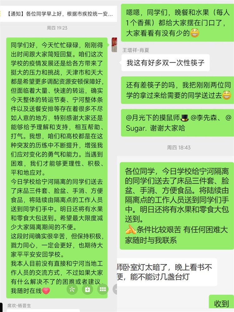 面对200余名隔离学生,学院始终将学生的生命安全和身心健康放在第一位,用心用情守护学生、陪伴学生,以关心送信心,筑牢疫情防线。学工队伍始终奋战一线,9月1日凌晨的彻夜未眠,早晨六点过万的微信步数,摸排情况、统计流调数据、通知安抚隔离学生、连夜转运隔离学生、组织学院全员大筛、组织志愿者一起为校内静默学生送餐......分类分层组织开展转运隔离、数据统计、核酸检测、静默学生管理等工作,“事事有回应,件件有着落”是学工队伍最朴素最深情的承诺。