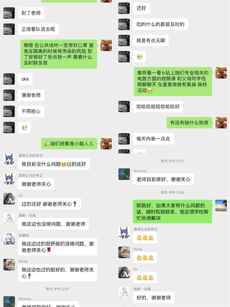 班主任队伍迅速响应工作布署,第一时间关注询问学生们的思想动态和身心健康,安抚焦虑情绪,组织班级骨干确保信息畅通,以备及时处理解决学生困难。“可以在b站看看视频,做做有氧操运动运动放松心情。”亲切温暖的话语,充满温度的解答,抚慰了一颗颗被疫情变化扰动的心。