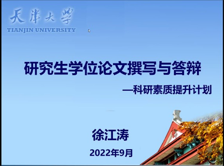 徐江涛从天津大学学位论文总体要求、学位论文评审要点、学位论文撰写和关键要点等四个方面,对学位论文的撰写进行了详细的讲解。他首先向同学们介绍了天津大学学位论文的总体要求,并提醒同学们把握开题、中期、论文撰写、评审盲审、答辩等重要环节,然后重点分析论文撰写的各个部分,根据学术型博士、学术型硕士和专业型硕士的评审要点,结合其多年学位论文指导经验,总结学位论文撰写过程中的摘要、绪论、正文、参考文献等各个章节的注意事项。并结合获奖优秀学位论文、盲审过程出现负面意见学位论文实际案例,具体分析学位论文写作过程中容易出现的问题部分和答辩中的注意事项,提示同学们要以科学、严谨的态度对待学位论文。通过本次讲座,同学们基本掌握了学位论文的撰写要点和规范,对学位论文写作有重要的指导意义,讲座取得了良好的效果。