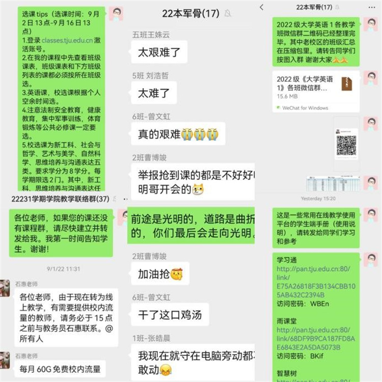 主动加入多个课程平台技术群,梳理学生使用平台遇到的问题,总结各大平台使用技巧,整理学生使用的手册,转发给各个年级学生。