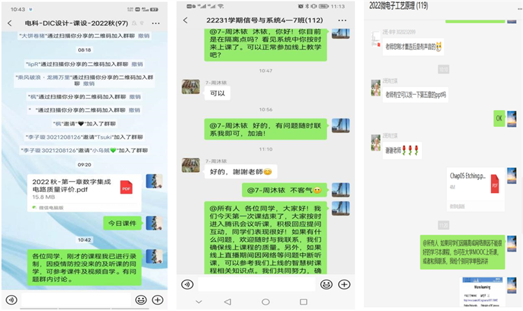 本科《固态电子学》的授课教师王秀宇老师,承担着专业核心、课程设计等大课的教学任务,课时量大、覆盖面广,面对此次疫情,王老师第一时间组建了选课班级群,及时与选课学生取得联系,排查学生可能遇到的问题,以细心、耐心和责任心筑牢云端课堂的守护线。