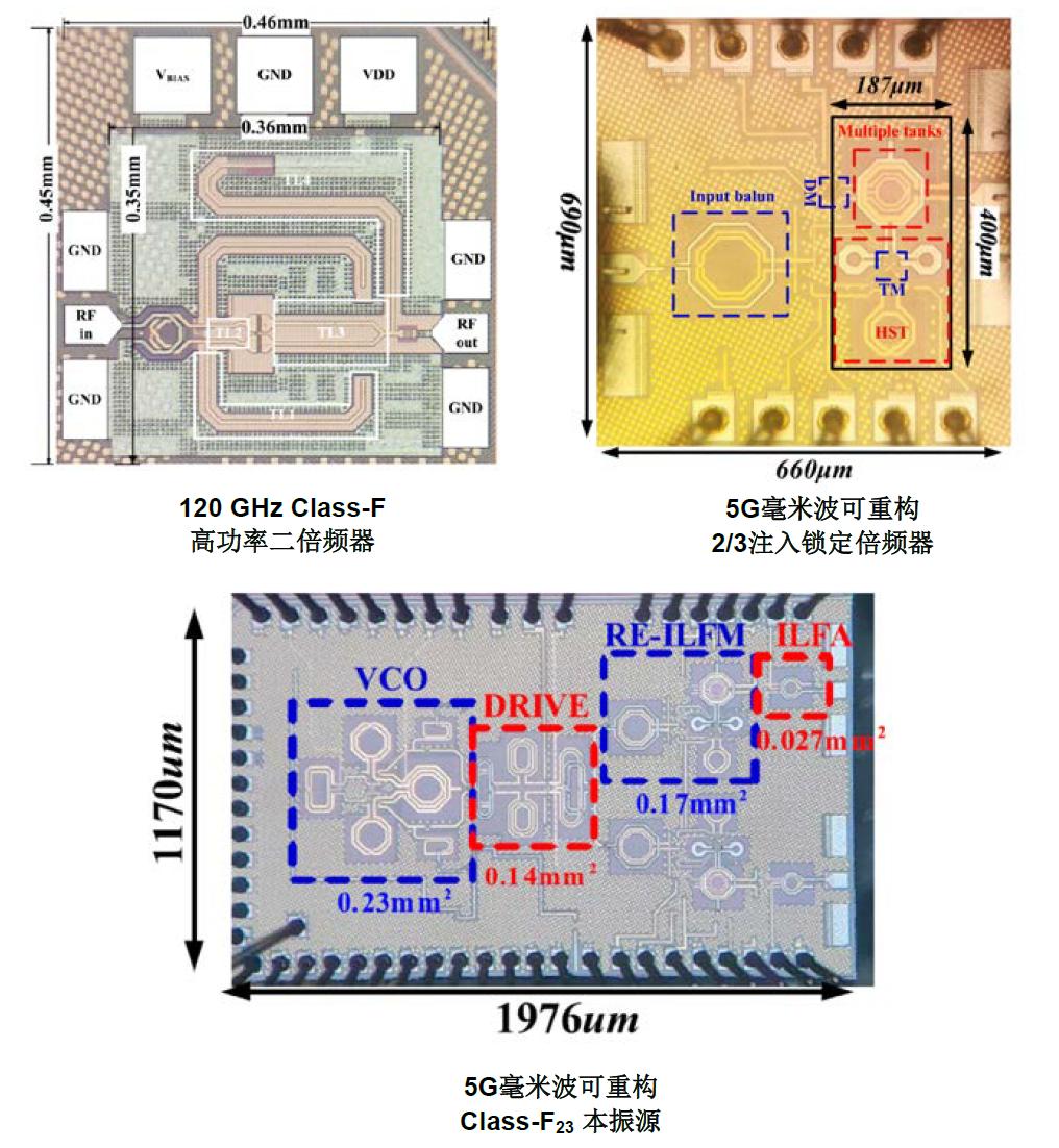 团队博士生王志鹏基于电磁调控理论提出应用于5G/6G通信的多核频率可重构注入锁定倍频器, 利用马凯学教授国际上提出的多谐振荡器腔(multi-tanks)技术将二倍频和三倍频重构实现,在兼顾小型化与高效率的同时,实现了5G毫米波所需的20.7 GHz~43.8 GHz 的全频带覆盖。该款芯片是国际上首款2倍/三倍频率可重构注入锁定倍频器芯片, 在相同注入功率情况下,锁定带宽、输出功率、面积以及谐波抑制指标均处于国际领先,为5G毫米波多频段、多标准融合通信系统的实现提供了技术支撑。提出的应用于5G通信的低相位噪声Class-F23 VCO,解决传统谐波控制VCO的谐波阻抗峰值易受PVT影响发生偏移的问题,在无校准开关电容的情况下,实现极小1/f3噪声角波动。进一步结合基于电磁调控技术的可重构注入锁定倍频器、注入锁定驱动放大器,设计实现双频低相位噪声、高效率毫米波锁相频率源系统芯片SOC,完成对5G毫米波所需的 22.25~28.61 GHz和35.9~42.044 GHz 的双频带覆盖,在1 MHz 频率偏移处,实现了-104.1 dBc/Hz 和-100.67 dBc/Hz 的相位噪声。
