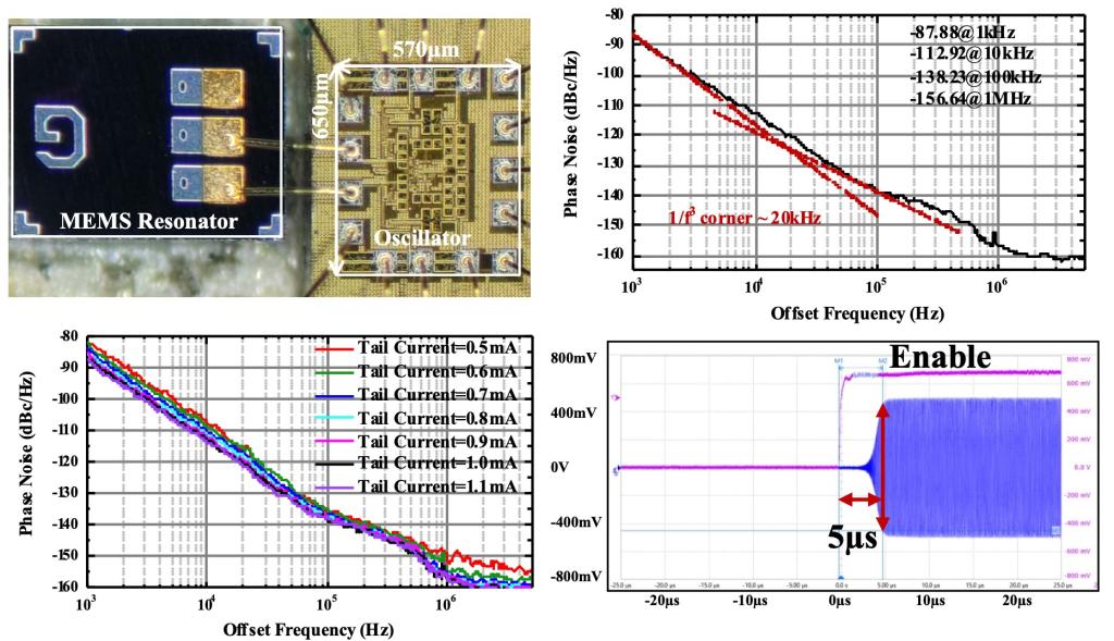 振荡器是电子系统的“心脏”,提供基准频率和参考时钟信号,是电子设备中最基础和最重要的部分之一。薄膜体声波谐振器(FBAR)具有尺寸小,Q值高,可与CMOS工艺相兼容等显著优势,能够明显改善传统石英、LC和RC振荡电路的不足。结合FBAR谐振器设计低相噪快速启动振荡电路可为无晶振射频系统提供一种新方案,具有重要的意义。该参赛作品采用180nm CMOS工艺,设计了一款基于FBAR谐振器的2.4GHz低相噪快速启动振荡器芯片。提出了一种基于Darlington单元负阻增强的Colpitts电路结构,采用动态体偏置技术,显著增强负阻同时有效缩短了起振时间。振荡器偏置在电流-电压限制区临界区域,改善了相位噪声性能。测试结果表明,电路功耗小于1mW,相位噪声为-138.23 dBc/Hz@100kHz, -156.64 dBc/Hz@1MHz,FoM值高达226,启动时间约为5 μs,实现了相位噪声、FoM值与起振时间方面的综合性能全面提升。
