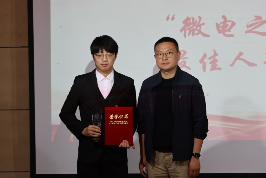微电子学院党委书记贾果欣、副书记韩旭为“微电之星”获得者颁奖。