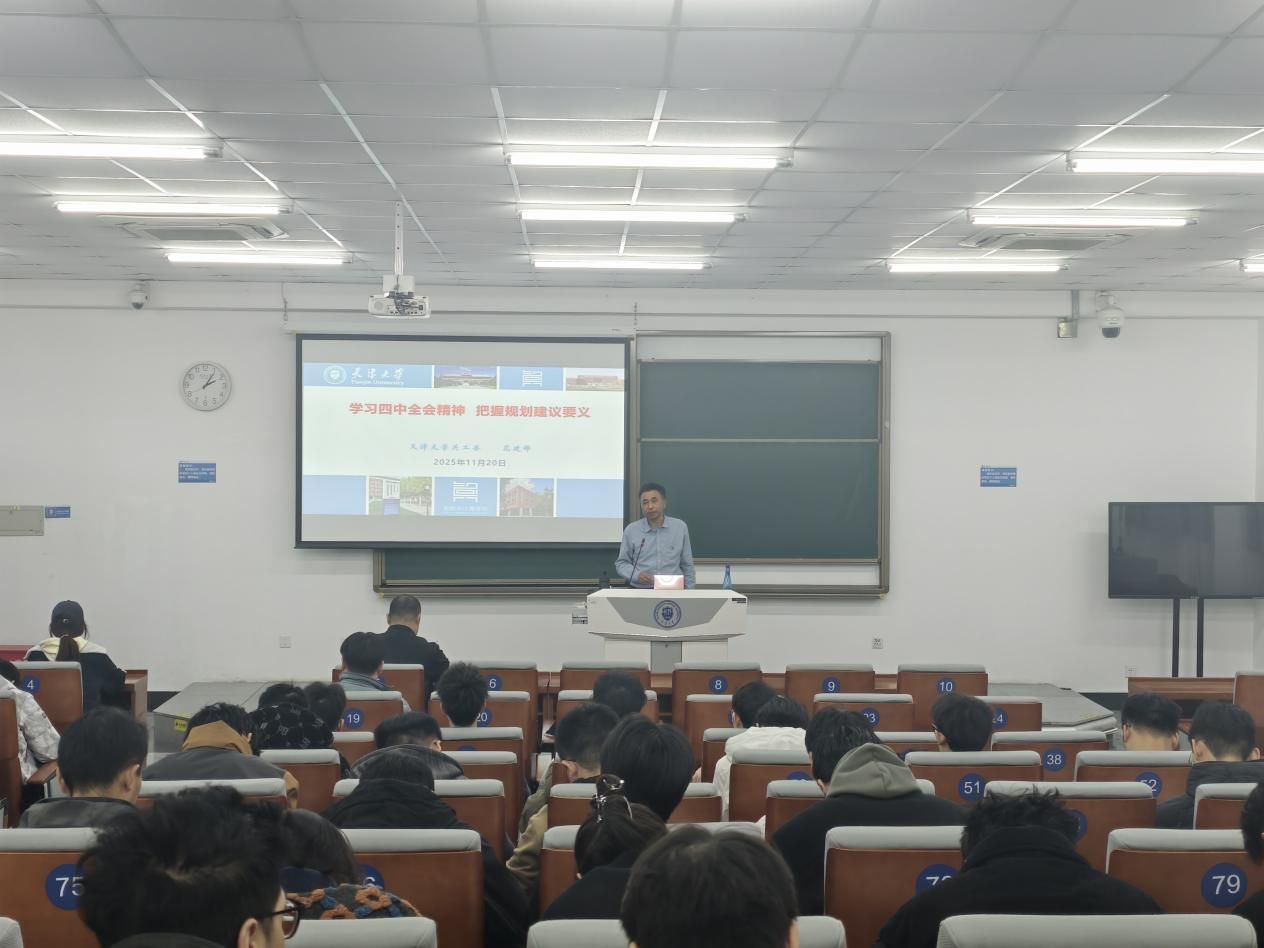花建锋作题为《学习四中全会精神、把握规划建议要义》的专题辅导报告,从“十五五”规划建议的主要内容、“十三五”规划以来的发展脉络、把握“十五五”规划要义的思考系统阐述了新时代新阶段国家发展的战略导向、核心任务与实践路径,深入解读了规划建议中关于科技创新、人才培养、教育强国建设等关键部署的深层逻辑,清晰梳理了从 “十三五” 夯基垒台、“十四五” 提质增效到 “十五五” 谋篇布局的发展演进,为学院师生党员精准把握国家发展大局提供指引。