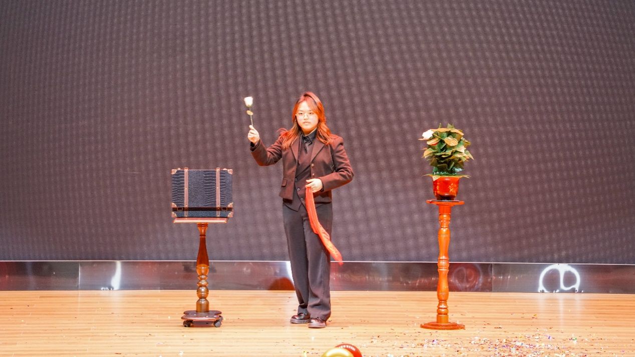 魔术协会吴韵仪表演魔术《玫瑰》,以浪漫手法绽放指尖奇迹,为晚会增添神秘与梦幻色彩。