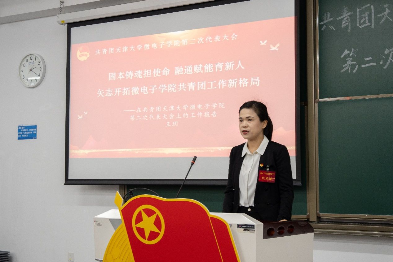 微电子学院团委书记王玥代表第一届委员会作了题为《固本铸魂担使命 融通赋能育新人 矢志开拓微电子学院共青团工作新格局》的工作报告。报告系统回顾了过去五年团委在筑牢信仰根基、锻造组织筋骨,贯通产学资源、激发创新动能,实践锤炼成长、展现青春风采,护航青年学生成长成才等方面的工作与成绩,并结合习近平总书记重要回信精神与学院发展实际,明确了未来一段时期的工作方向:一是深化引领,筑牢产业报国的青春信念;二是聚力赋能,搭建服务青年成长的广阔舞台;三是强基固本,激发共青团组织的内生动力;四是融入大局,引领青年在奋斗中实现价值。