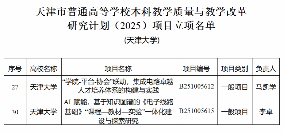 本站讯(通讯员:石惠)近日,天津市教育委员会相继发布首批天津市级普通高校新形态教材建设项目及2025年天津市本科教学质量与教学改革研究计划项目立项名单,我院申报的4个项目全部获批立项,其中《系统级芯片(SoC)设计》《电子线路基础》获批新形态教材建设立项、《“学院-平台-协会”联动,集成电路卓越人才培养体系的构建与实践》《AI赋能,基于知识图谱的〈电子线路基础〉“课程—教材—实验”一体化建设与探索研究》获批本科教育教学改革项目立项。