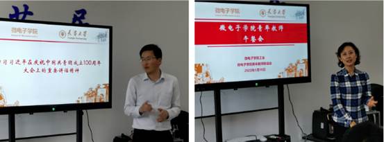 午餐会上,刘强副院长首先代表学院欢迎近期入职的四位教师,颁发微电子学院“新入职青年教师纪念册”。新教师们畅谈个人的入职经历以及对学院快速发展的感受,感谢学院党委和班子的关心关怀。接下来刘强副院长向参会青年教师传达学校第三次人才工作会议精神,组织教师们对学校和学院的人才引进、发展和保障工作进行探讨。教师代表们纷纷表示优秀人才是学校发展的基石,人才引进需要广拓渠道,从全球视野角度发现领域内的领军人才和具有重大潜力的人才,做好沟通对接和持续跟进,创新人才引进方法。已入职的青年教师需持续提升育人能力,全面提升教学水平,努力打造“金课”。而后党委副书记韩旭带领青年教师代表共同学习了习近平总书记在庆祝中国共青团成立100周年大会上的重要讲话精神,指出学院青年教师身处育人第一线,须立足国情、校情、院情,发挥立德树人的表率作用,对学生做好正向的引导。最后,院长马凯学和党委书记贾果欣分别为青年教师送上寄语,号召全体教师讲政治、讲正气、讲学习,立足微电子学院发展把握个人方向,发挥先锋模范作用,以行动为集体带来温暖。