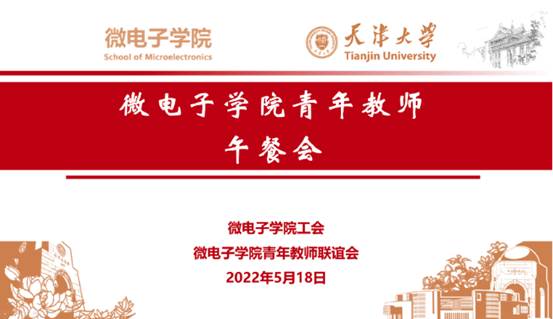 2022年5月18日,天津大学微电子学院青年教师联谊会(“青椒会”)在学院工会之家举办午餐会,微电子学院党委书记贾果欣、院长马凯学及学院领导班子成员出席活动,学院青椒理事会成员、新入会教师以及青年教师代表参加。午餐会由学院工会主席,副院长刘强主持。