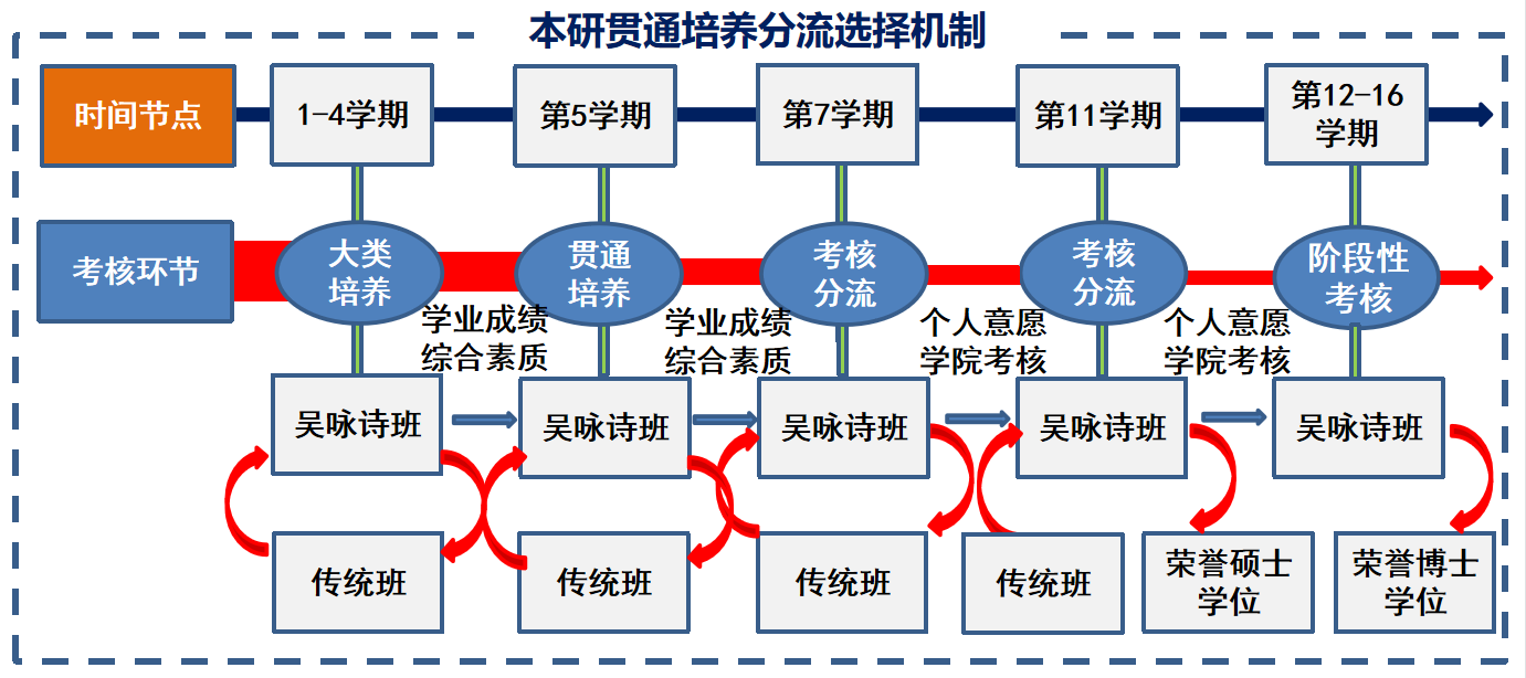 吴咏诗班的行政管理依托于学生的原行政班级。教学活动,包括贯通课程/跨学院课程的选课上课、科研活动、课外活动等,以吴咏诗班形式进行。实行配备包括班导师、思想引路人、学术导师和企业导师的导师团制度,实现思想引领、职业规划、学术指导和名师示范的全方位、全周期指导和引导。提供专门的实践活动空间和平台。学生在导师指导下,制定每学期培养计划和目标产出,并在导师指导下开展学习和科研工作,在每学期期末填写个人小结,由导师填写学期鉴定意见,并由学院本研贯通人才培养工作小组对其学期的学习和科研工作情况进行阶段考核。