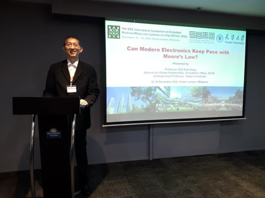 会议中,新加坡工程院院士、新加坡国家科学院院士、天津大学微电子学院讲席教授杨杰圣受邀做题为“Can Modern Electronics Keep Pace with Moore's Law?”的特邀讲座。本次演讲提出并解答了“电子革命的步伐能否与摩尔定律保持同步?在嵌入式系统设计与技术领域,又面临着哪些亟待解决的挑战?电子技术是否已经发展至极限,还是仍有新的突破在前方等待?下一个重大技术革新将会是什么?它又将如何深远地影响我们的生活?”等问题。此外,还探讨了在未来技术革命中值得关注的其他新兴趋势。
