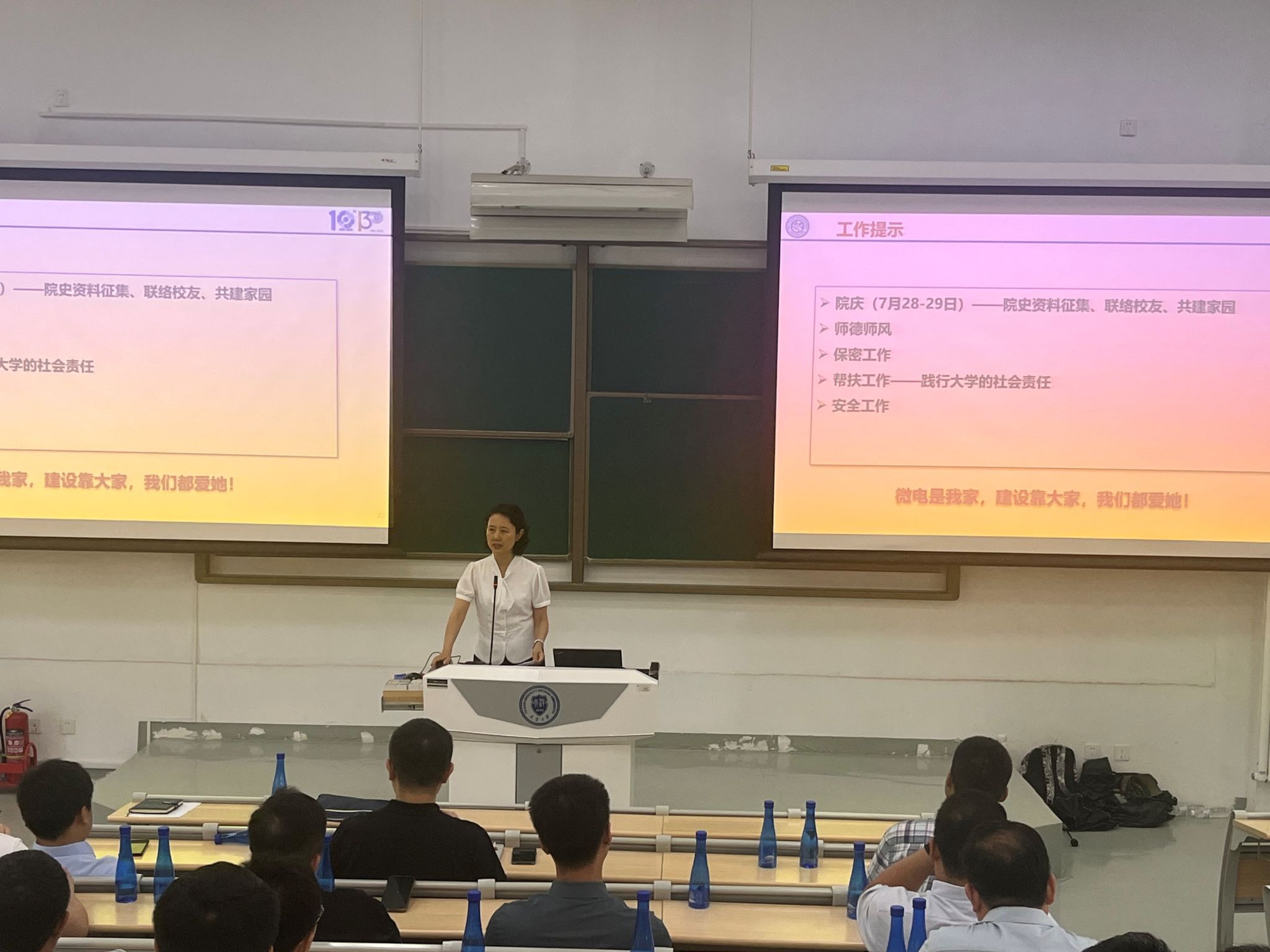 党委书记贾果欣指出,要以党建引领学院各项事业发展,将党建与教学、科研、管理服务等工作深度融合,将作风建设贯穿工作始终。全体教职工要严守师德师风要求,严格遵守教学纪律、学术规范等各项规章制度,以高尚的师德师风引导和教育学生,做到教书与育人相结合。同时强调,新时期广大教工要守牢安全、保密等工作底线,践行帮扶的社会责任,团结一心,勇于创新,积极进取,为将学院建设成为国内一流、国际知名的微电子学院而努力奋斗,以优异成绩迎接天津大学建校130周年、微电子学院成立10周年。