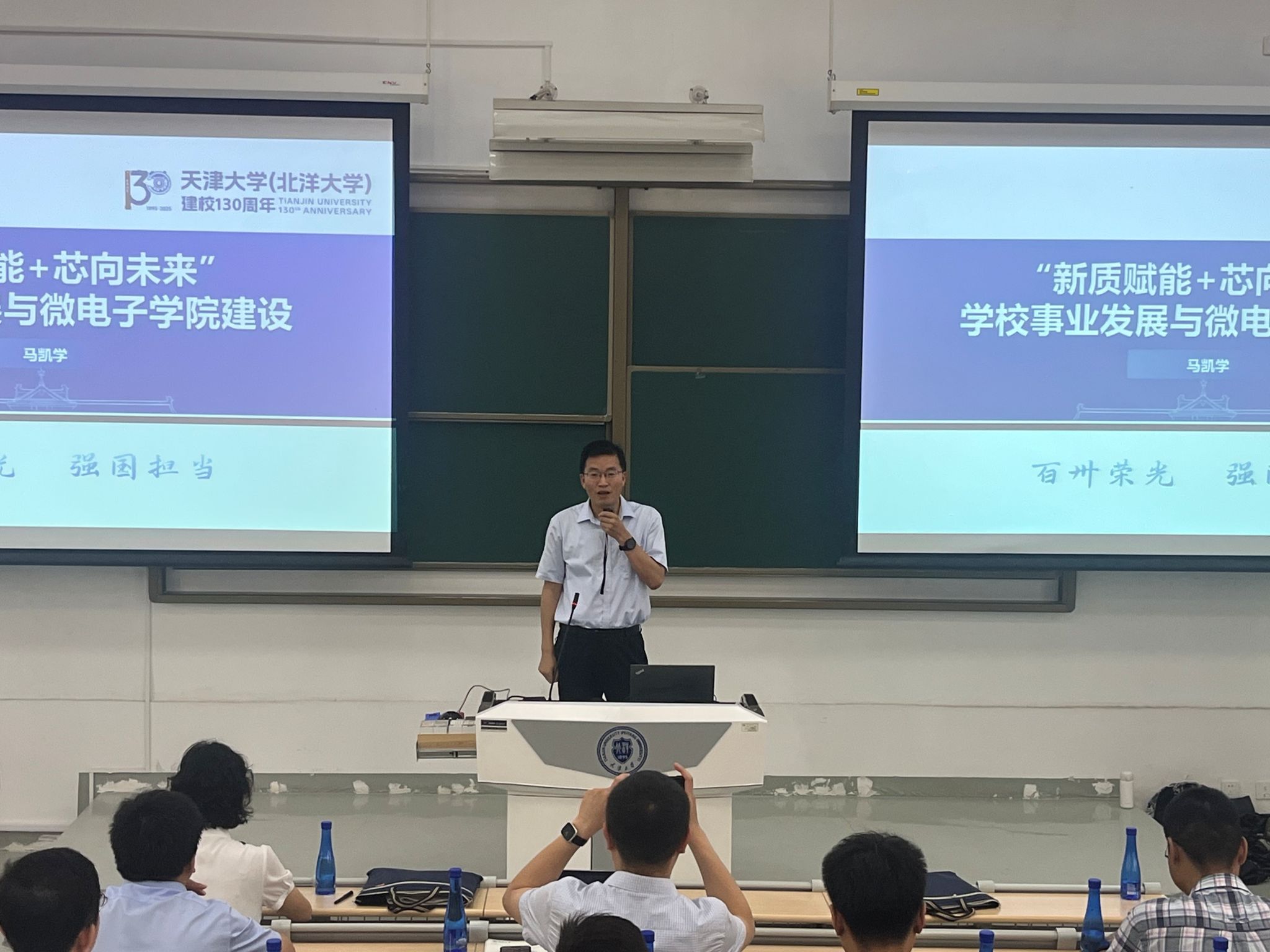 会上,院长马凯学作了题为《“新质赋能+芯向未来”——学校事业发展与微电子学院建设》的报告,总结了本学期学院在人才培养、科学研究、师资队伍、国际交流和社会服务等各方面所取得的工作成效。同时,深入分析了学院当前面临的机遇与挑战,如行业快速发展带来的对人才培养更高要求、日益激烈的学科竞争等。他强调,全体教职工要聚焦新形势、新任务,在学校和学院党委的坚强领导下,以只争朝夕、奋勇争先的精神,全力以赴推动学院事业的高质量发展,为建设教育强国、助力天津大学迈入世界一流大学前列而奋斗!